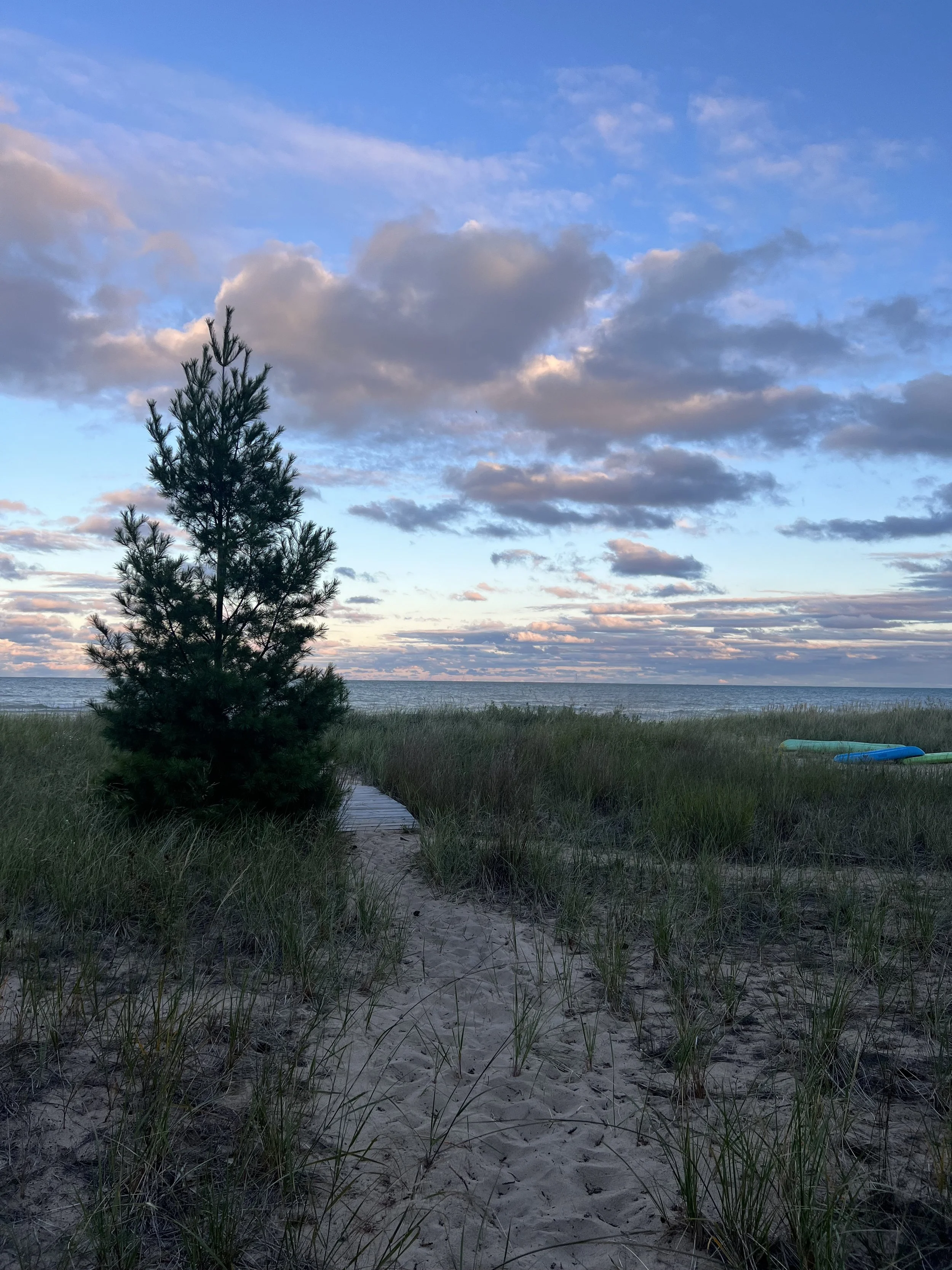 Each morning we watched the sun rise over Lake Huron, the horizon stretching wide and full of possibility. Long walks along the beach became a meditation—the shoreline is never the same twice, always shifting and changing with the water and wind. Our stretch of beach is its own living ecosystem, and we are constantly inspired by what it reveals: birds and butterflies pausing to rest, small animals moving through their life cycles, evidence of growth, birth, and renewal.